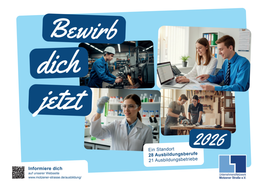 Das UnternehmensNetzwerk Motzener Straße e.V. stellt jedes Jahr eine Ausbildungsbroschüre, die eine Vielzahl von Angeboten zu freien Ausbildungsstellen, Praktikumsplätzen und dualen Studienplätzen enthält, zur Verfügung. Darüber hinaus beinhaltet die Broschüre Aussagen zu den Berufsbildern am Standort. Sie ermöglicht den Schüler*innen einen umfangreichen Überblick über die Ausbildungsangebote am Standort und trägt dazu bei, dass Ausbildungsplätze gezielt vermittelt werden können.